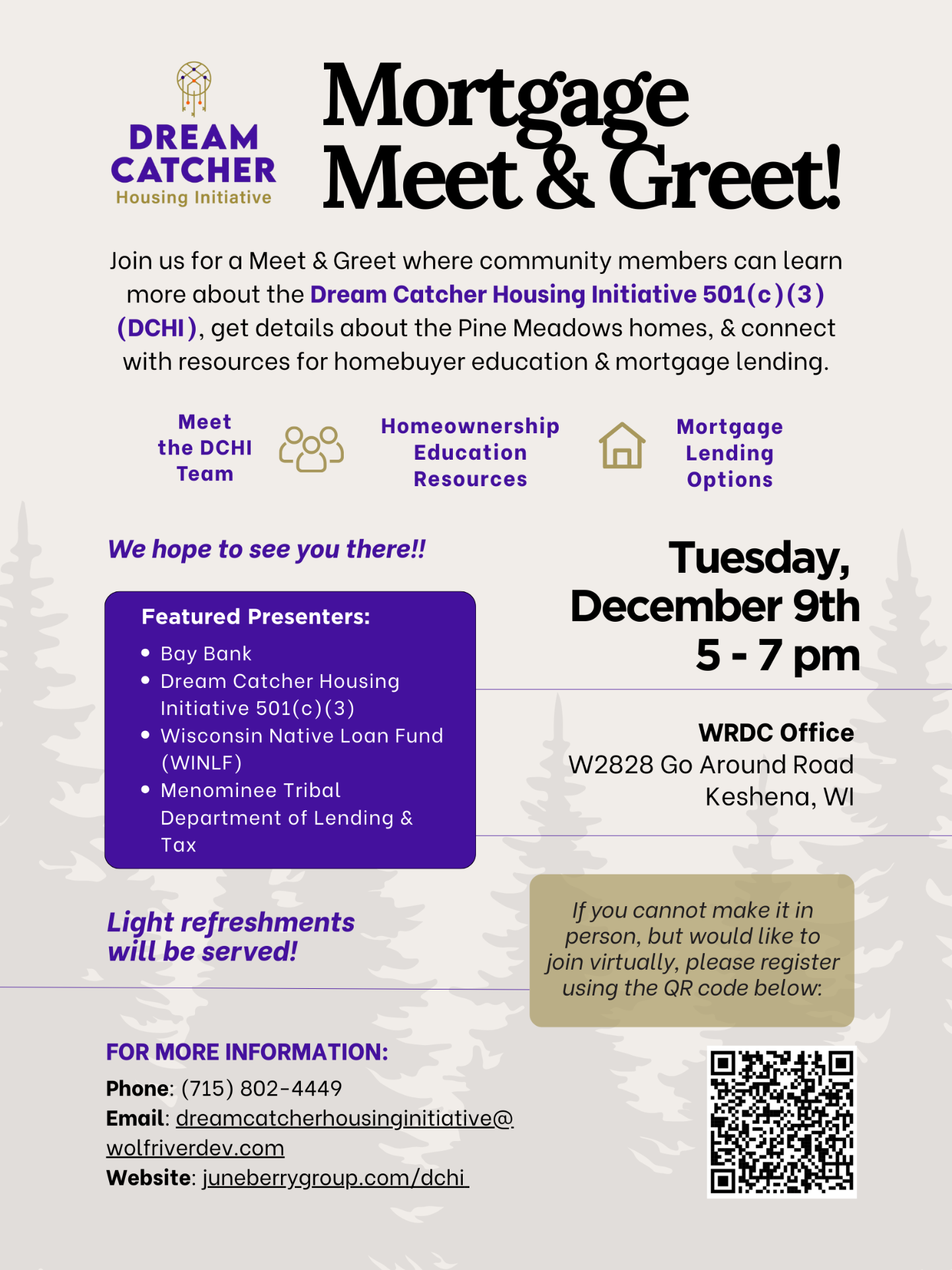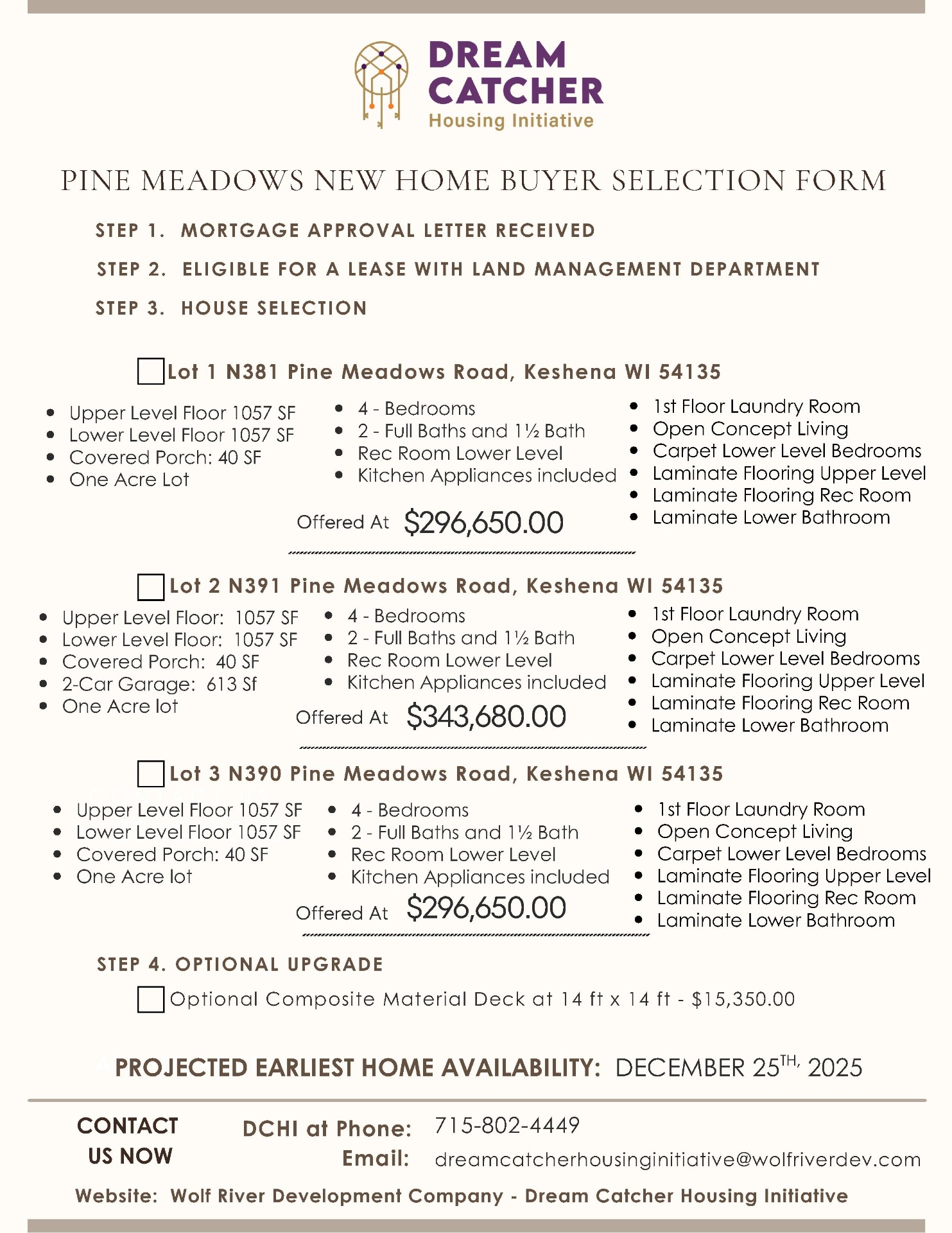 The Pine Meadows Homes are expected to be available for purchase in late 2025 and completed in early 2026. This project marks an important milestone in Dream Catchers' mission to expand homeownership opportunities and build a stronger future for the Menominee Nation.