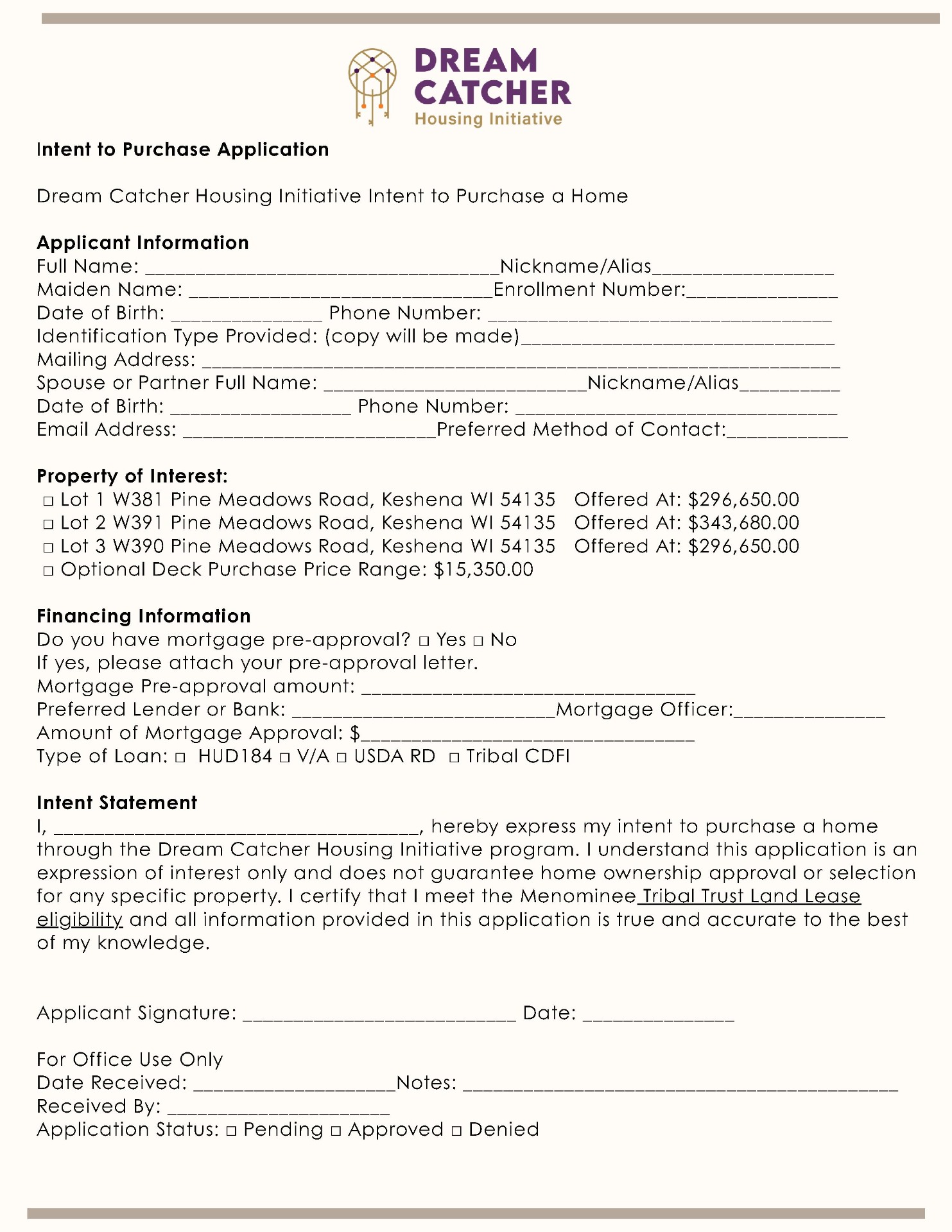 Dream Catcher Housing Inititiative Intent to Purchase Form