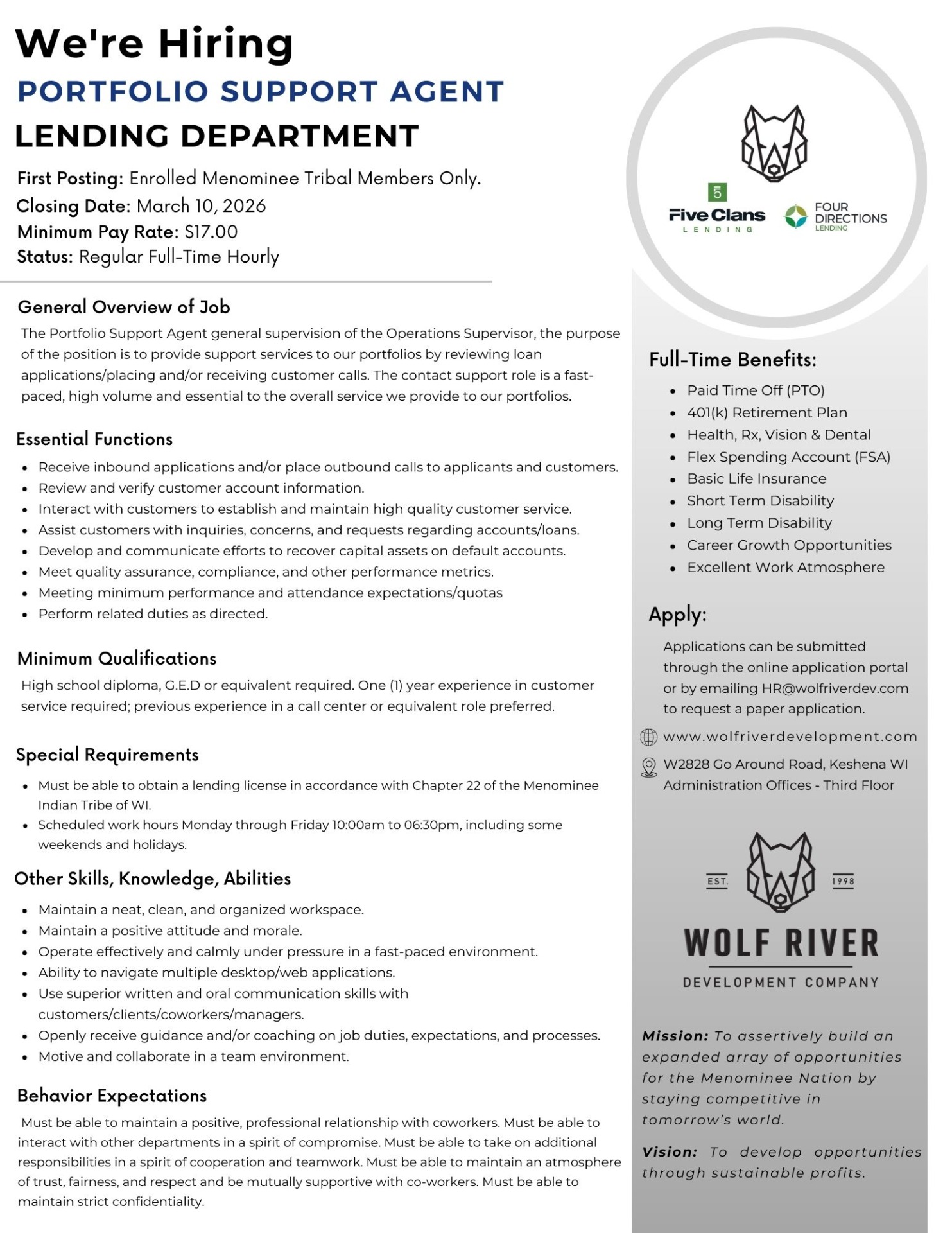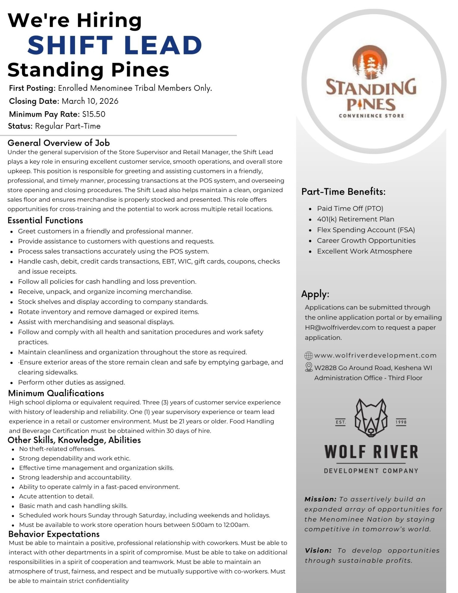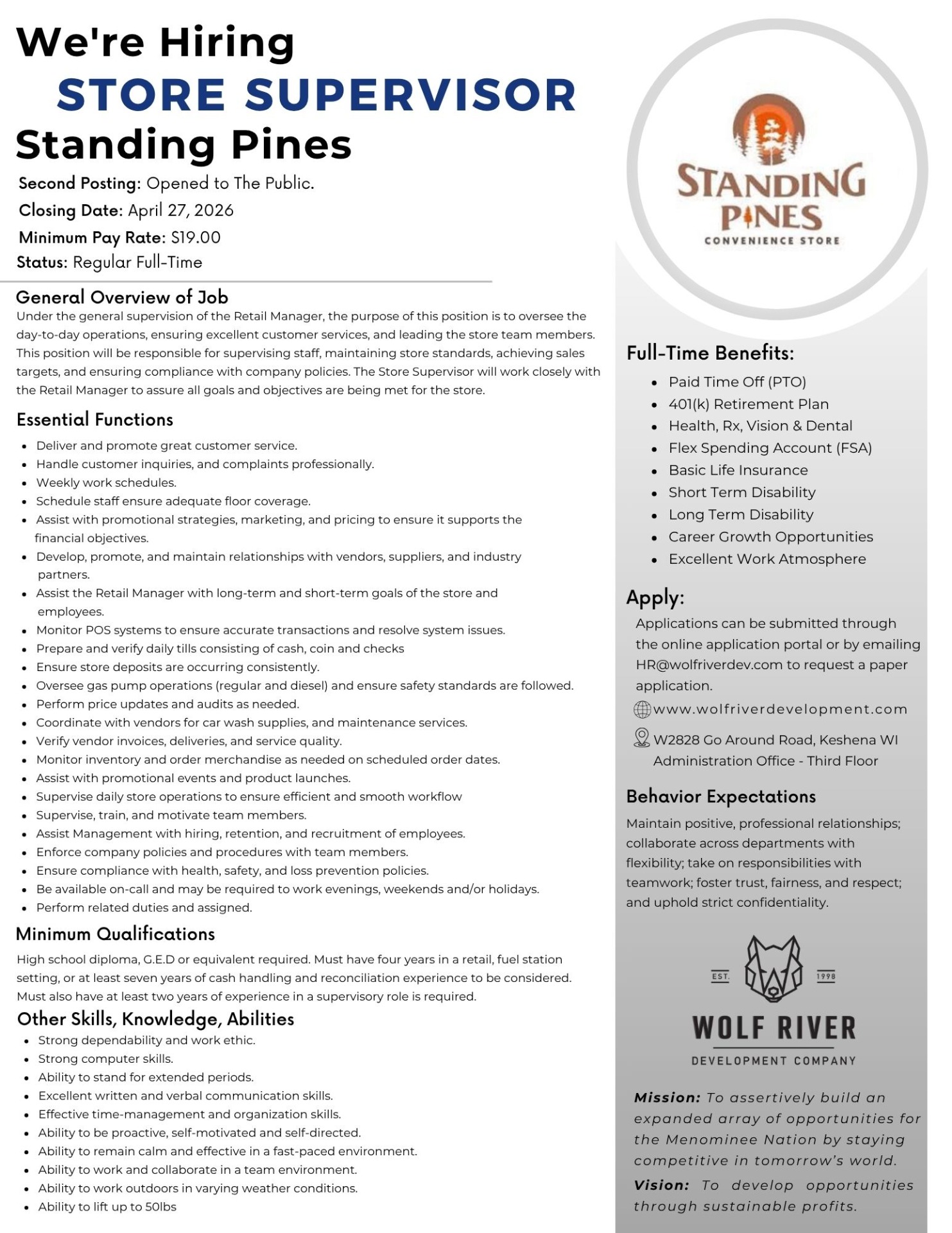FIRST POSTINGS: are open to Enrolled Members of the Menominee Tribe per Chapter 170.