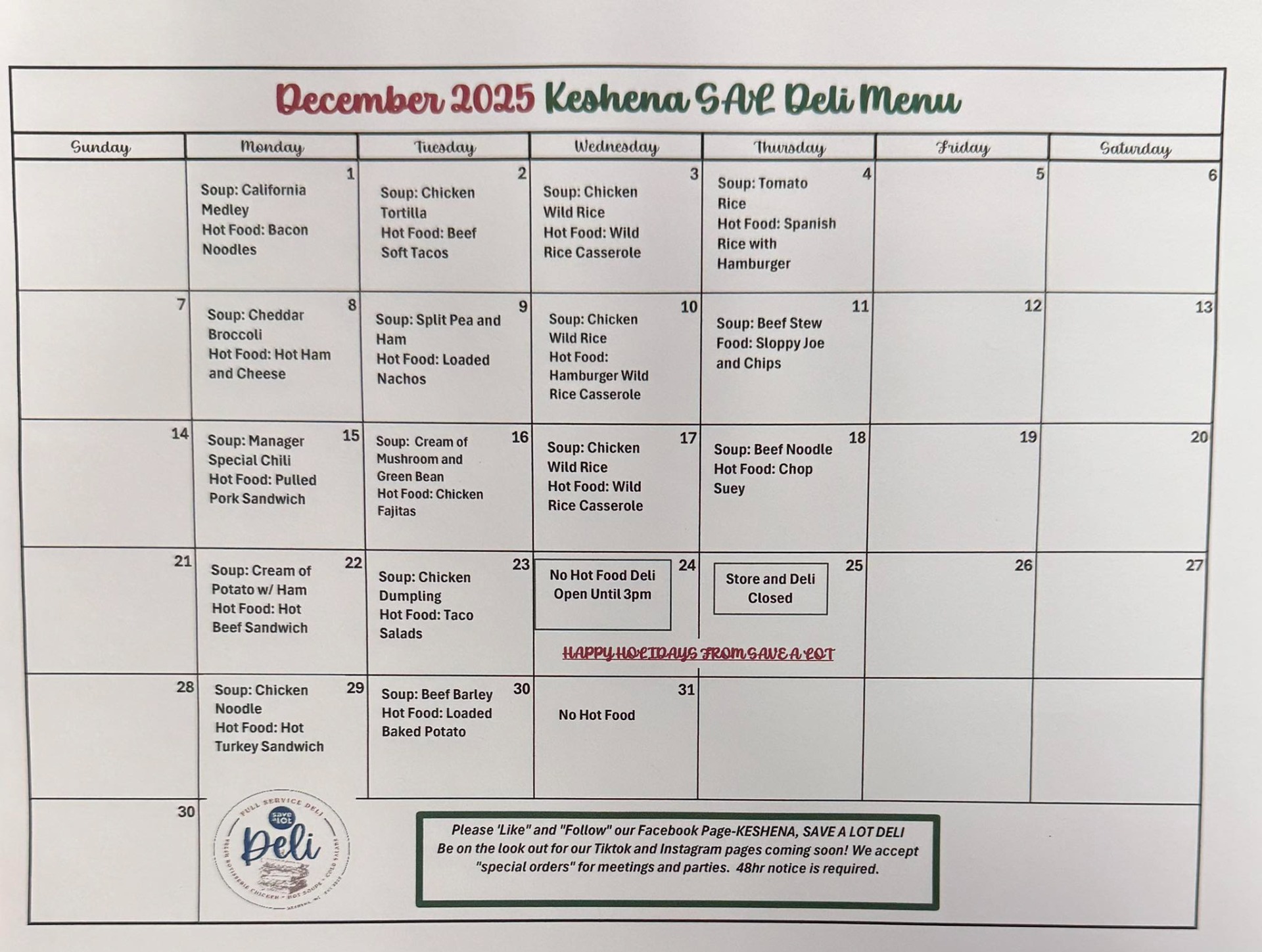 2025 Holiday Schedule